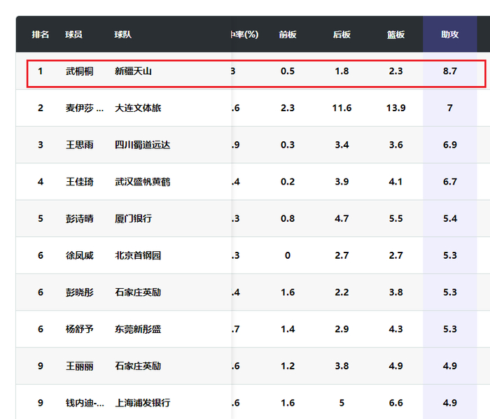 武桐桐本赛季场均得到18.2分2.3篮板8.7助攻1.6抢断。她的投篮命中率为45.8%,三分命中率37.9%,罚球命中率83%。武桐桐在联赛助攻榜排名第一,此外她在本土得分榜高居第一。再加上她率领上赛季排名联赛倒数的新疆女篮成为季后赛级别的球队,武桐桐毫无疑问是本赛季表现最出色的本土球员。